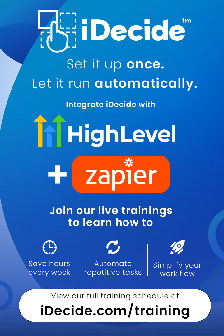 Did you know you can integrate your iDecide account with GoHighLevel and Zapier? If not — now you do! These integrations allow you to create custom workflows that run automatically, helping you save time and streamline your follow-up.