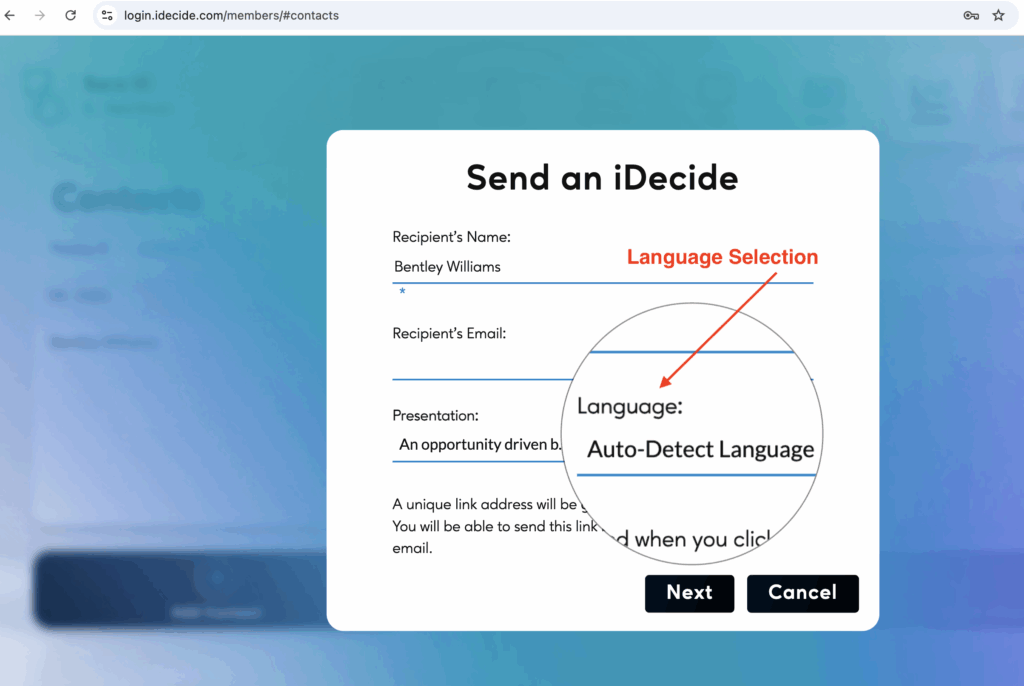 Your company may have each language set up as its own presentation. In this case, you’ll see a separate option for each language in the Presentation dropdown when you create a link. Just choose the presentation in the language you want to send to your prospect, then create and send the link as usual.