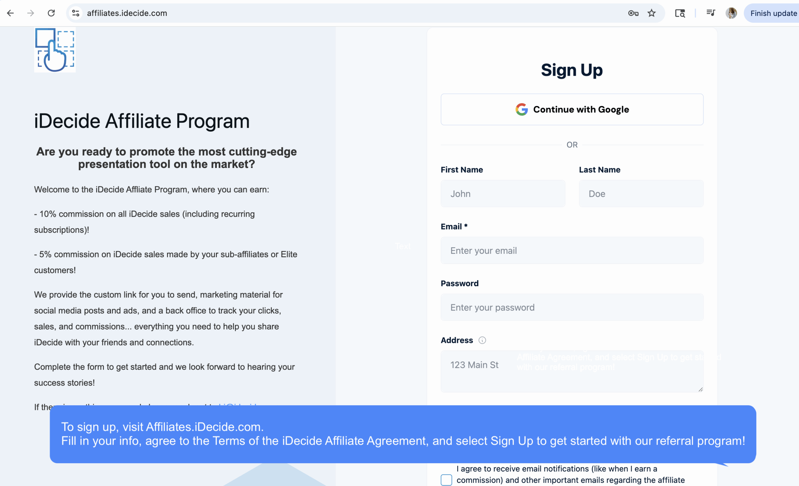 We provide the custom links for you to send, marketing material for social media posts, advertisements, and an Affiliate Dashboard to track your clicks, sales, and commissions… everything you need to help you share myiDecide with your friends and connections. With every successful referred customer or affiliate, you earn!