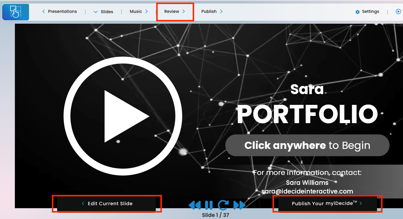 At the bottom you'll see the "Publish Your myiDecide" button to move onto the final step, or the "Edit Current Slide" so you can easily make any changes you catch during your review.