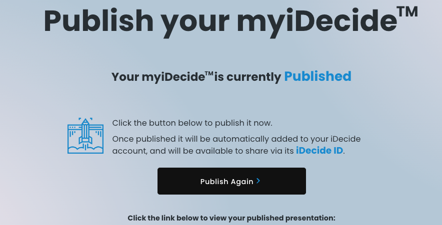 After clicking the "Publish Your myiDecide" button on the Review step, you'll see a success screen that looks like this: